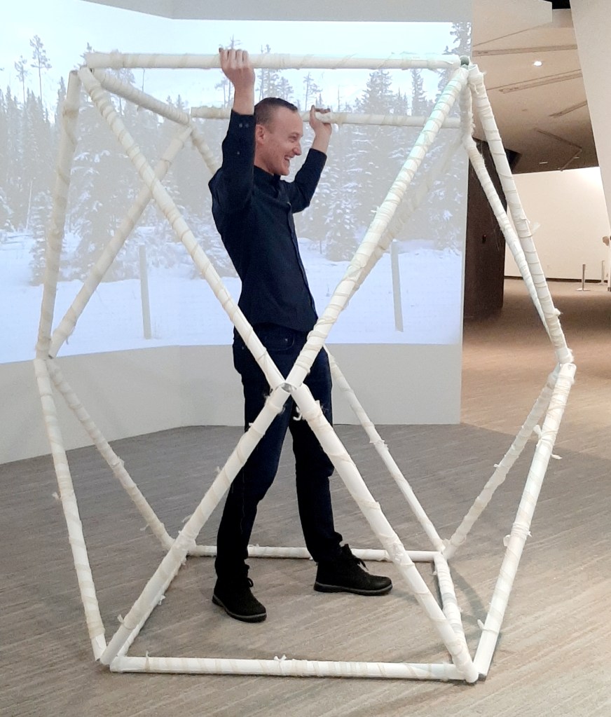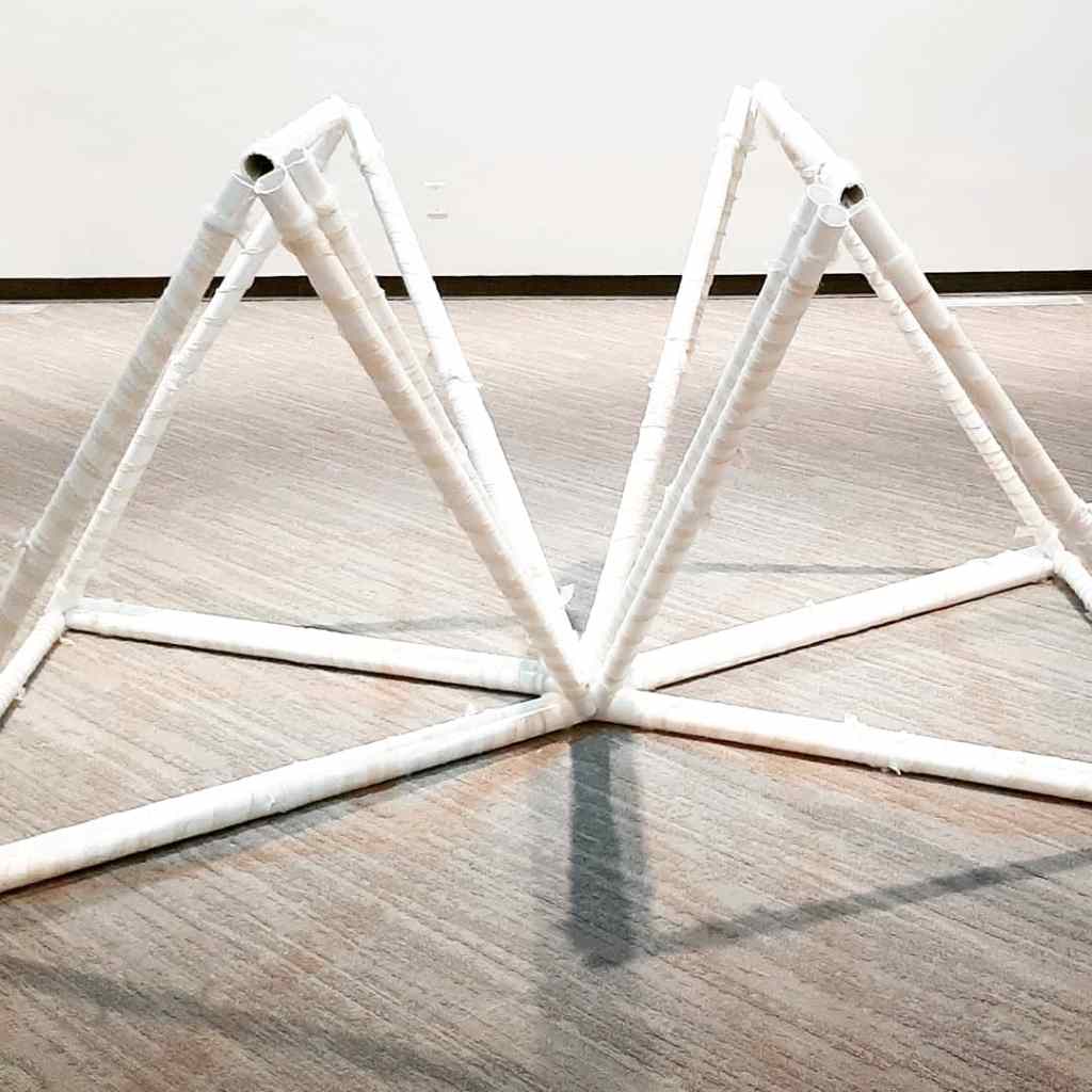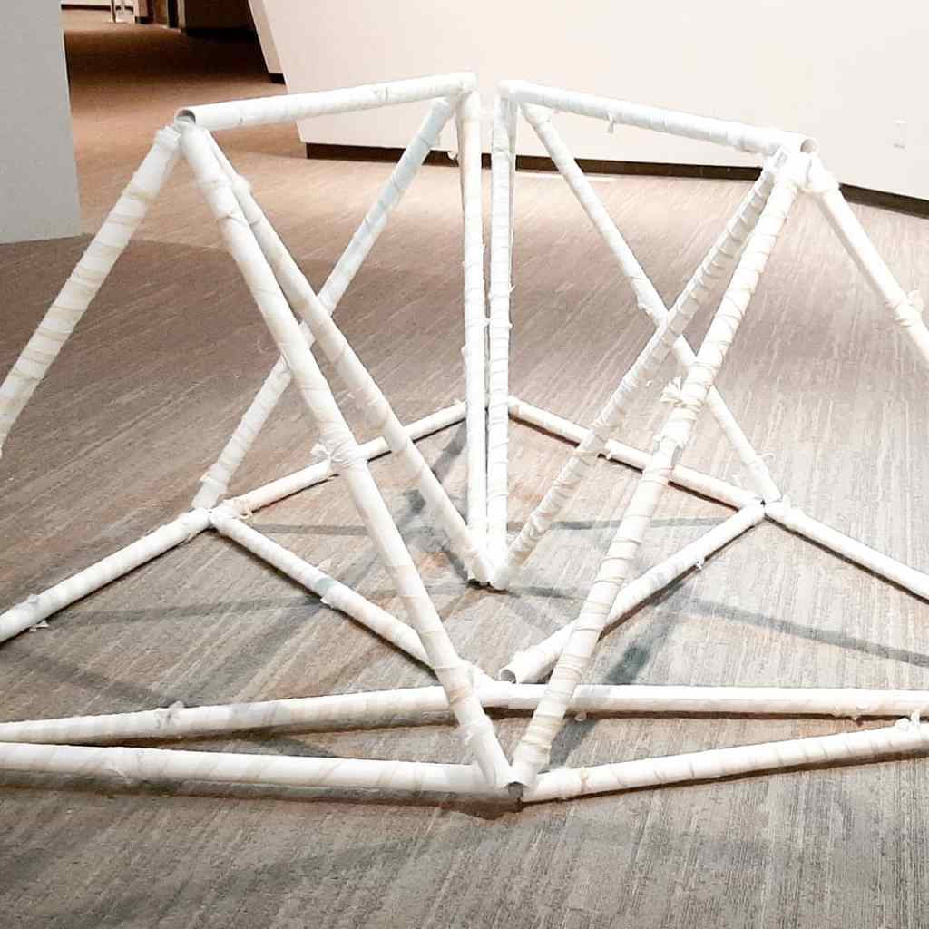 ‘Earth Map’ Jennifer Ireland, 2020: To do ‘more with less’ was a guiding principal of designer and innovator Buckminster Fuller (1895 – 1983) and this idea resonates importantly still in our current times of climate change. Fuller’s ‘Dimaxion Map’ in which he wraps the map of the Earth on an polyhedron then unfolds it according to the geometric lines, creates a map with all the continents connected and was intended to serve as a means by which we could re-imagine trade, resource sharing and communication and ‘do more with less’. These ideas of Fuller’s are the inspiration for this ‘World Map’ sculpture. The sculpture is a human sized polyhedron, serving as an embodiment of an abstraction though which we can better understand our world and our relationship to it, thereby enabling participants to creatively explore both possibilities and limitations. Like all abstractions, it requires our engagement to support it, thus is rests in its collapsed form and is activated through play and interaction.